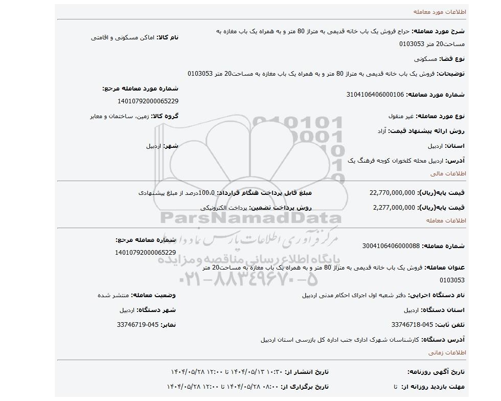 شرح مورد معامله: حراج فروش یک باب خانه قدیمی به متراژ 80 متر و به همراه یک باب مغازه به مساحت20 متر 0103053 | نام کالا: اماکن مسکونی و اقامتی | |