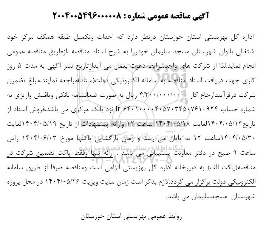 اداره کل بهزیستی استان خوزستان در نظر دارد که احداث و تکمیل طبقه همکف مرکز خود اشتغالی بانوان شهرستان مسجد سلیمان خودر را به شرح اسناد مناقصه از طریق مناقصه عمومی انجام نماید. لذا از شرکتهای واجد شرایط دعوت بعمل می آید از تاریخ نشر آگهی به مدت 5 روز کاری جهت دریافت اسناد مناقصه به سامانه الکترونیکی دولت (ستاد) مراجعه نمایند. مبلغ تضمین شرکت در فرآیند ارجاع کار - 4.300.000.000 ریال به صورت ضمانتنامه بانکی و یا فیش واریزی به شماره حساب 640100004057034507610924 IR نزد بانک مرکزی میباشد. فروش اسناد از تاریخ 1404.05.13 لغایت 1404.05.18 ساعت 12 وارائه پیشنهادات از تاریخ 1404.05.19 لغایت 1404.05.30 ساعت 12 به پایان میرسد و زمان بازگشایی پاکتها مورخ 1404.06.03 راس ساعت 9 صبح در دفتر معاونت پشتیبانی میباشد. ارائه تنها و فقط پاکت تضمین شرکت در مناقصه پاکت الف به دبیرخانه اداره کل بهزیستی الزامی است و مناقصه صرفا از طریق سامانه الکترونیکی دولت برگزار میگردد. لازم بذکر است زمان سایت ویزیت 1404.05.26 در محل پروژه شهرستان مسجد سلیمان می باشد.
