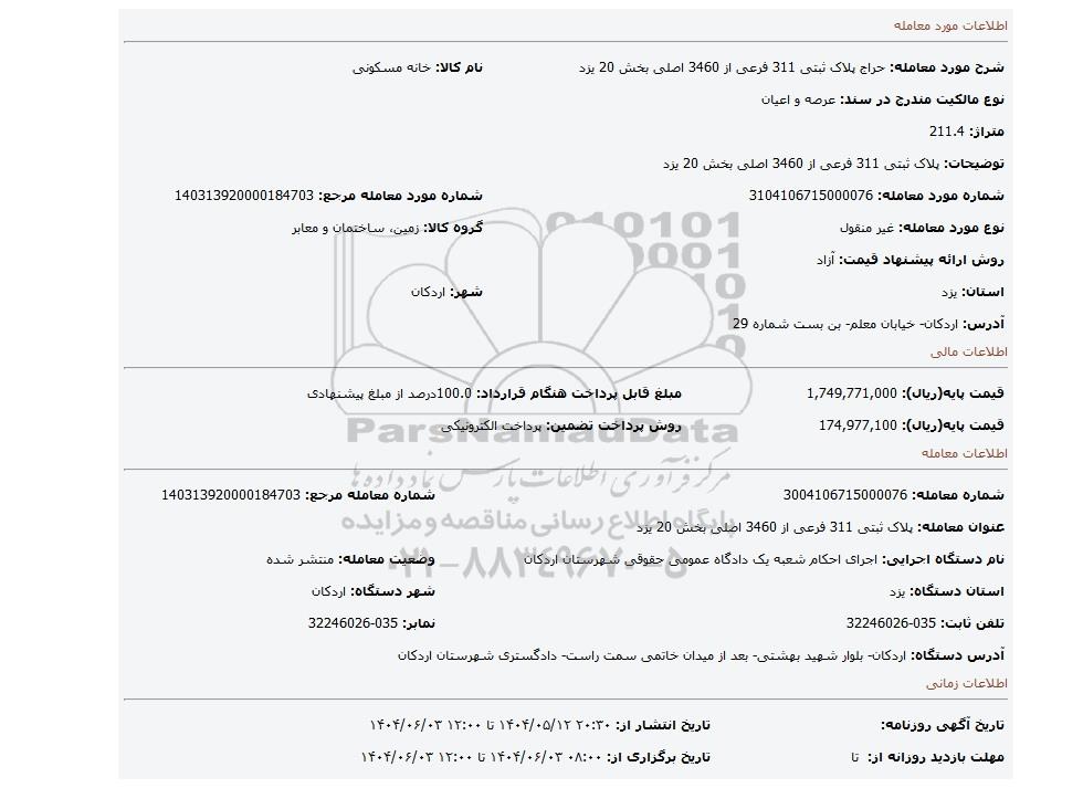 مزایده پلاک ثبتی 311 فرعی از 3460 اصلی بخش 20 یزد, مزایده، پلاک ثبتی 311 فرعی از 3460 اصلی بخش 20 یزد