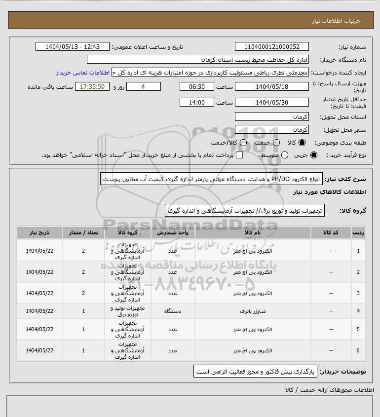شرح کلی نیاز: انواع الکترود PH/DO و هدایت، دستگاه مولتی پارمتر اندازه گیری کیفیت آب مطابق پیوست