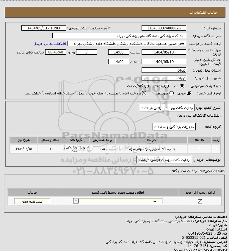 استعلام بها و موضوع استعلام استعلام رعایت نکات پیوست الزامی میباشد به اطلاع کلیه شرکتها و افراد متخصص واجد شرایط میرساند، آگهی گذار در نظر دارد از طریق استعلام بها، نسبت به انتخاب و دریافت پیشنهادات اقدام نماید. این استعلام با کد آگهی ثبت شده در سامانه خبرگزاری پارس نماد : 9365873 منتشر شده است. مشخصات استعلام : تاریخ شروع استعلام: 1404/05/13 آخرین مهلت ارسال پیشنهاد قیمت : 1404/05/18 و محل اجرای پروژه : استان تهران میباشد. استعلام قیمت مورد درخواست : استعلام رعایت نکات پیوست الزامی میباشد با دستهبندیهای تخصصی و گروه های مرتبط : خدمات و تجهیزات آزمایشگاهی و پزشکی, استعلام اطلاع رسانی میگردد.