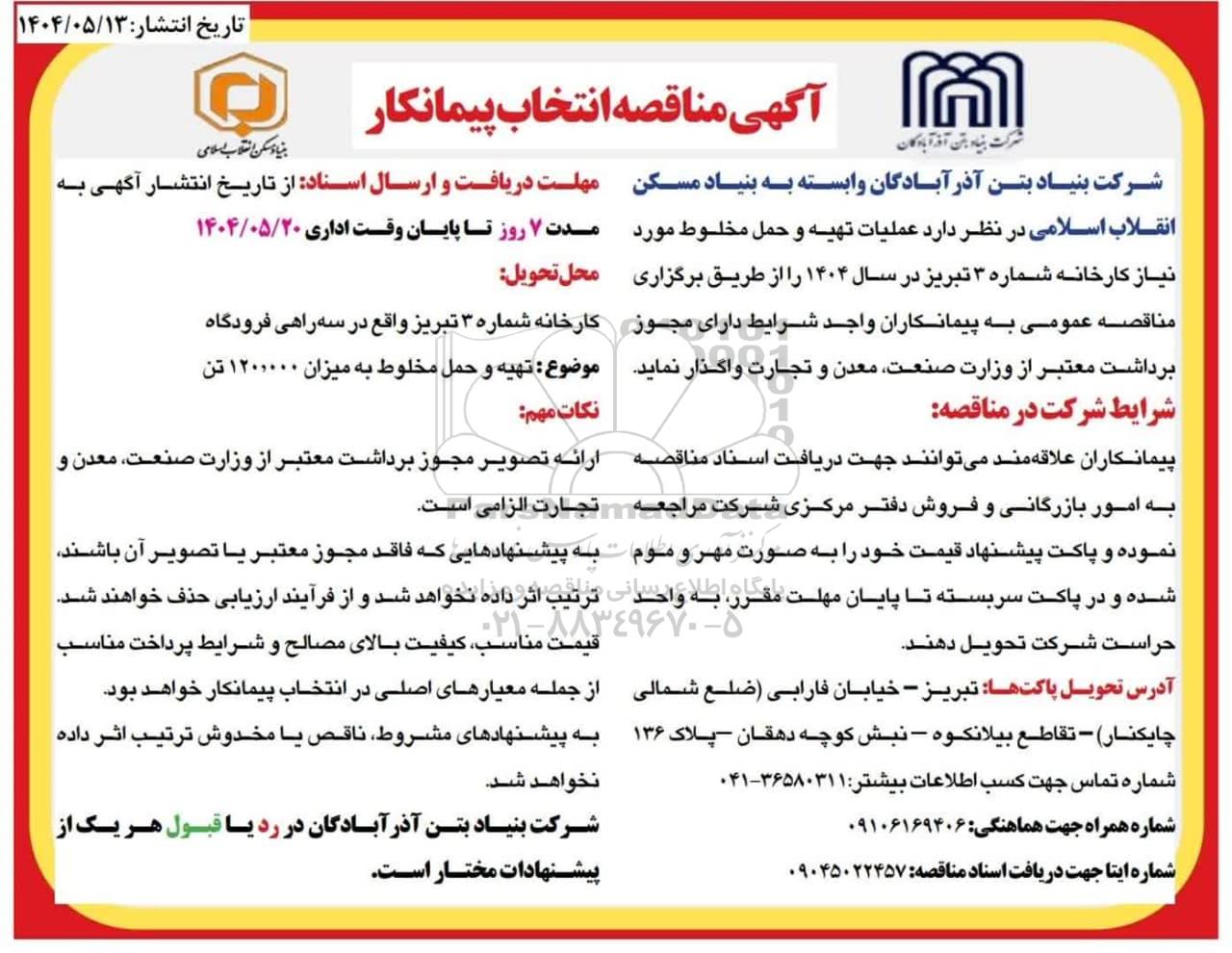 شرکت بنیاد بتن آذر آبادگان وابسته به بنیاد مسکن انقلاب اسلامی در نظر دارد عملیات تهیه و حمل مخلوط مورد نیاز کارخانه شماره 3 تبریز در سال 1404 را از طریق برگزاری مناقصه عمومی به پیمانکاران واجد شرایط دارای مجوز برداشت معتبر از وزارت صنعت، معدن و تجارت واگذارنماید.