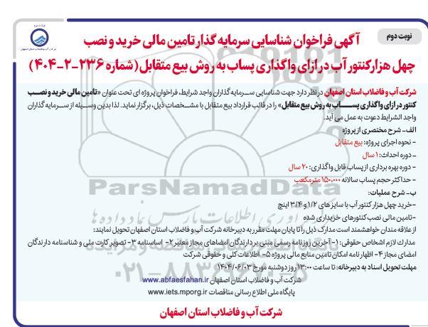 آگهی فراخوان شناسایی سرمایه گذارتامین مالی خرید و نصب چهل هزار کنتور آب در ازای واگذاری پساب به روش بیع متقابل (شماره 236-2-404) نوبت دوم