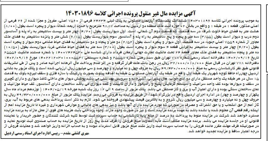 مزایده فروش یک دستگاه آپارتمان مسکونی به پلاک ثبتی 24234 فرعی از 7560 اصلی, مزایده فروش یک دستگاه آپارتمان مسکونی به پلاک ثبتی 24234 فرعی از 7560 اصلی