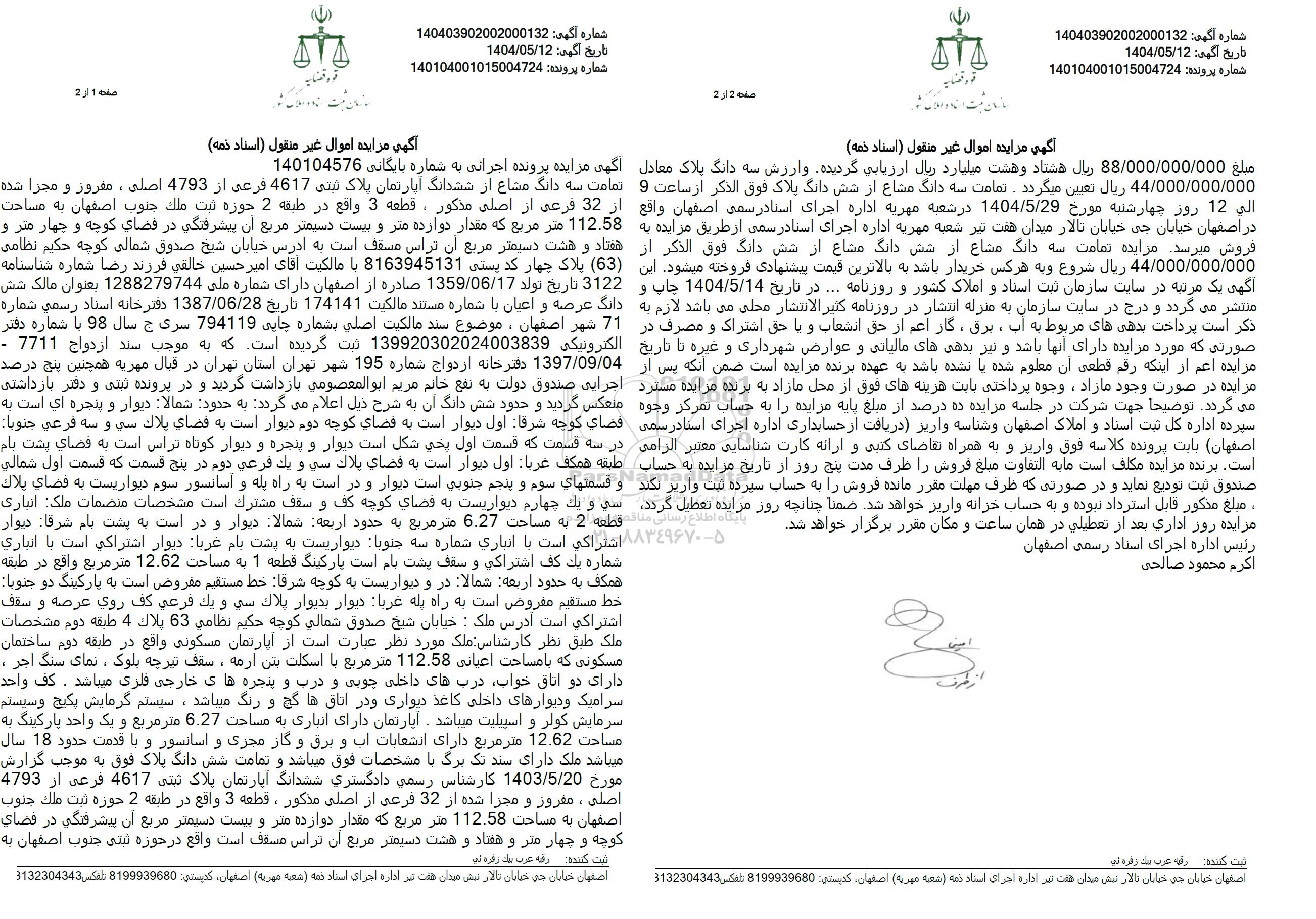 مزایده فروش سه دانگ از ششدانگ آپارتمان با پلاک ثبتی 4617 فرعی از 4793 اصلی