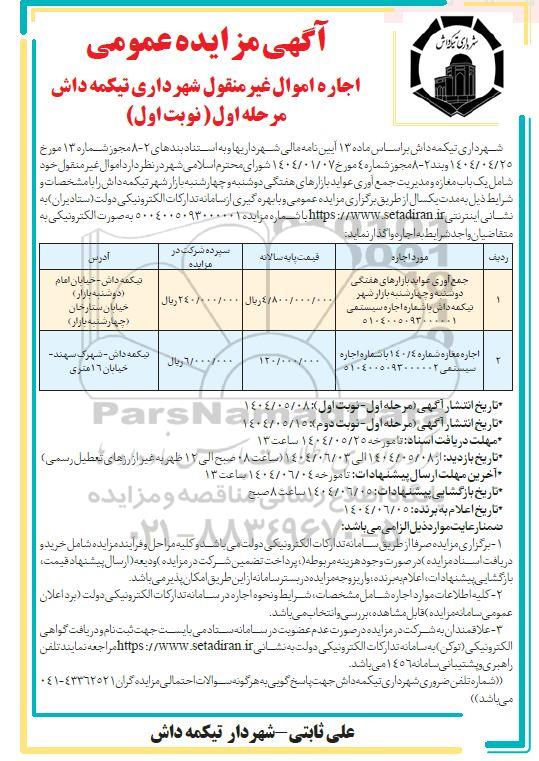 اجاره اموال غیر منقول شهرداری تیکمه داش (مرحله اول نوبت اول)