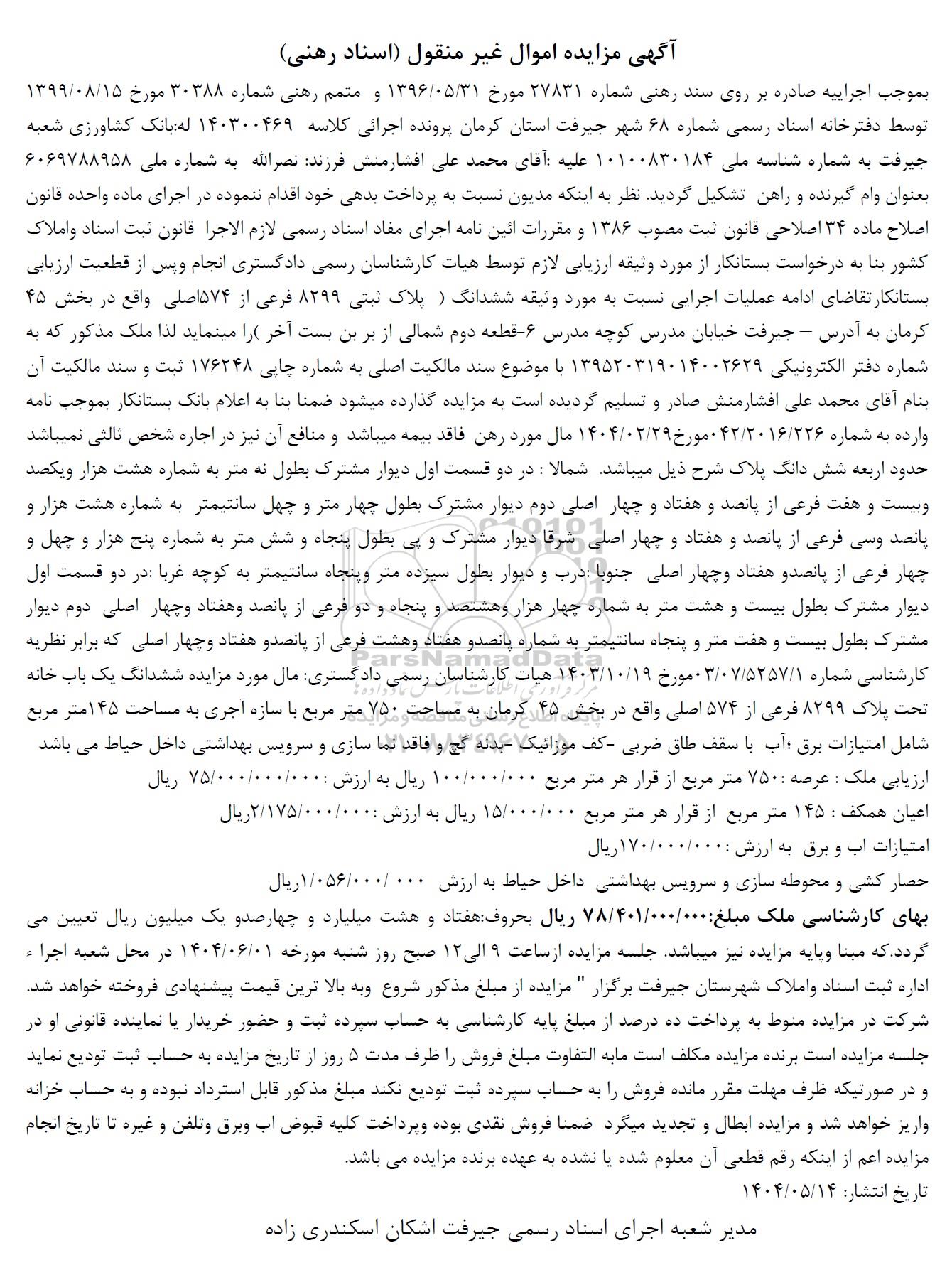 مزایده عمومی مزایده پلاک ثبتی 8299 فرعی از 574 اصلی برگزار میگردد. از کلیه افراد متخصص و شرکتهای واجد شرایط دعوت به عمل میآید تا در این مزایده با کد خبرگزاری پارس نماد : 9366420 شرکت نمایند تاریخ شروع مزایده : 1404/05/14 مهلت شرکت در مزایده: تا پایان روز 1404/06/01 مکان برگزاری اموال واگذاری استانهای کرمان و دستهبندیهای مربوط به این حراجی املاک و زمین میباشد.
