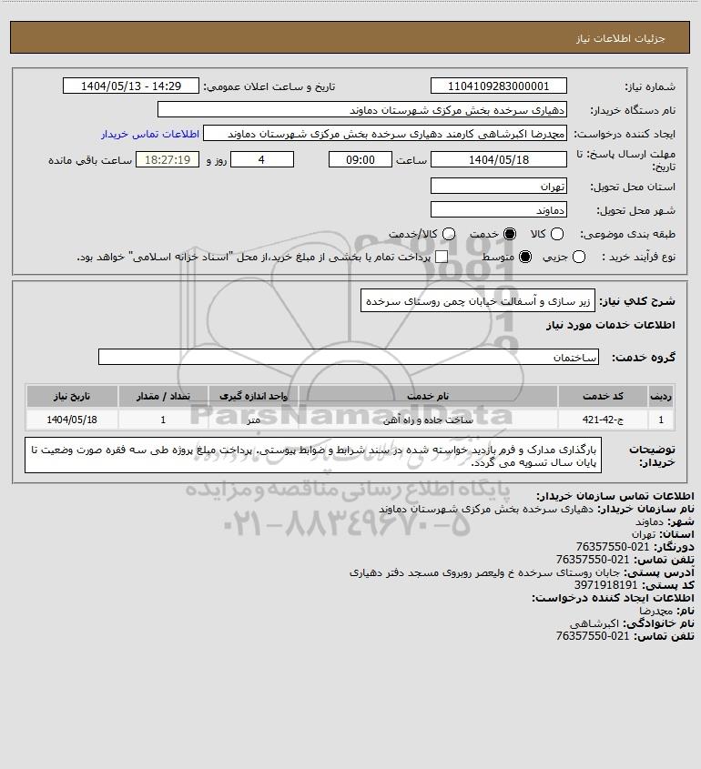 شرح کلی نیاز: زیر سازی و آسفالت خیابان چمن روستای سرخده