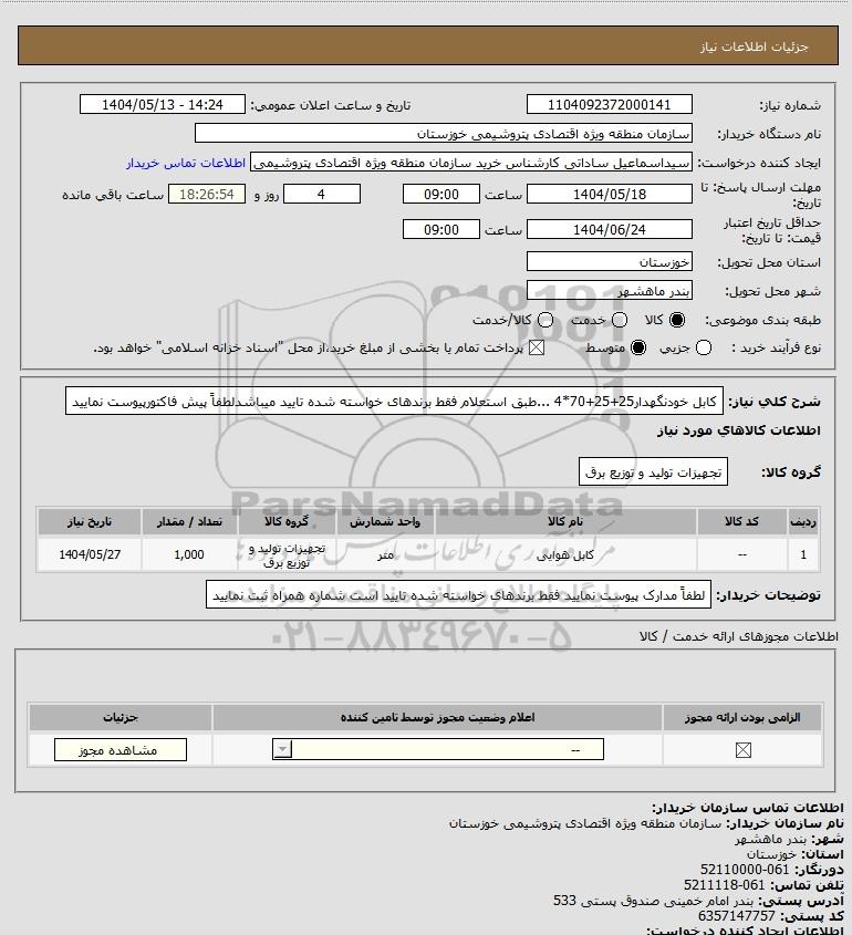 شرح کلی نیاز: کابل خودنگهدار25+25+70*4 ...طبق استعلام فقط برندهای خواسته شده تایید میباشدلطفاً پیش فاکتورپیوست نمایید