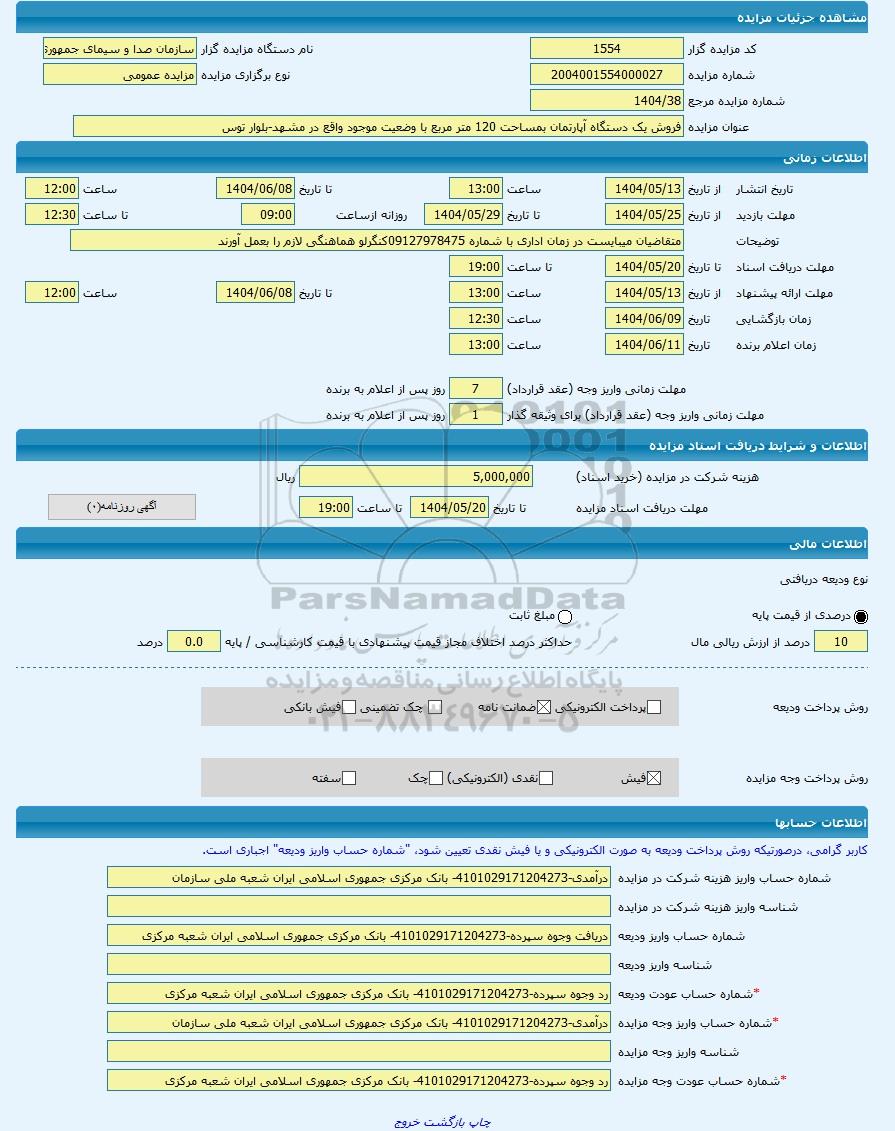 | عنوان مزایده | فروش یک دستگاه آپارتمان بمساحت 120 متر مربع با وضعیت موجود واقع در مشهد-بلوار توس -مزایده آپارتمان - استان خراسان رضوی | |||