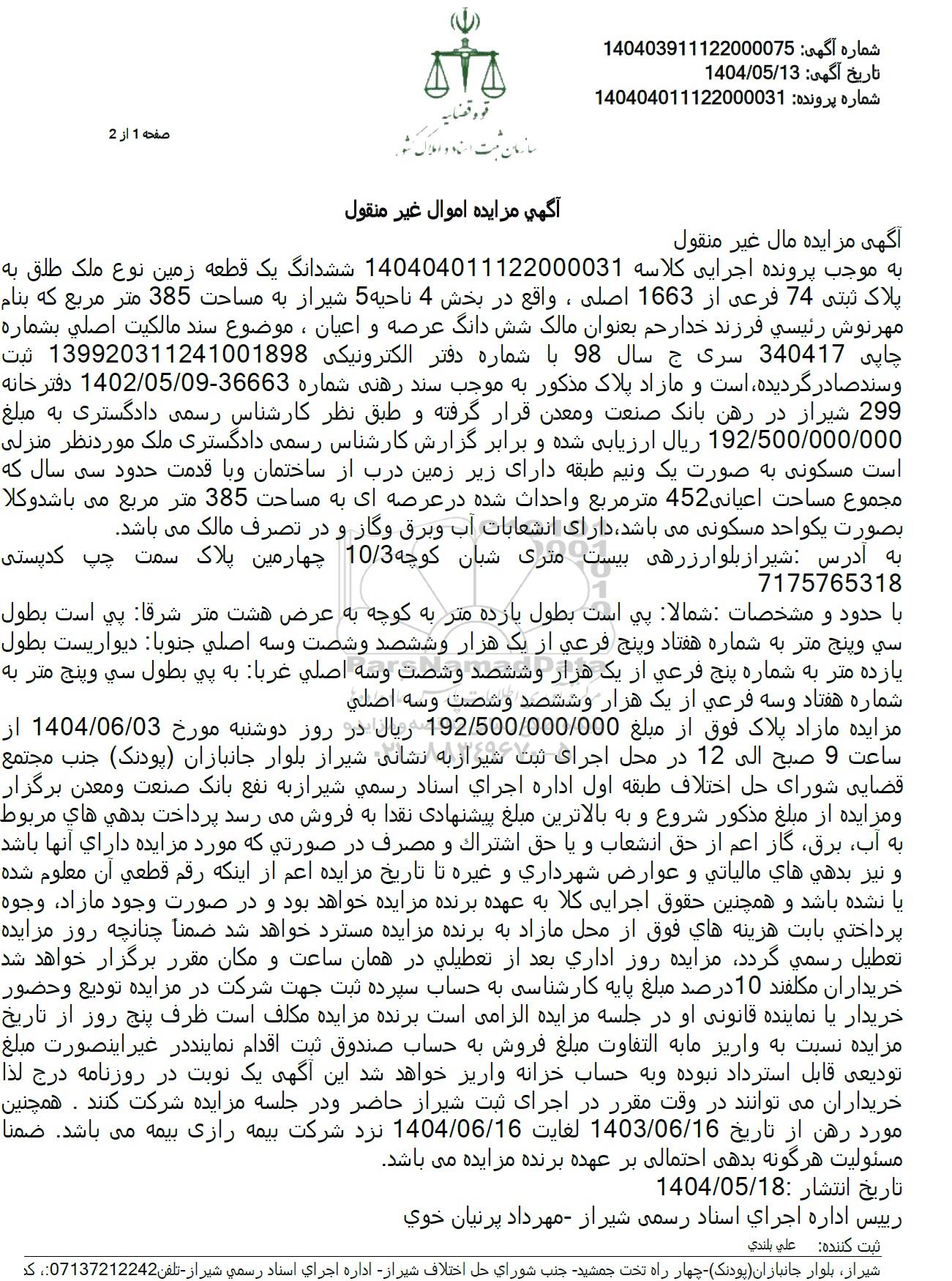 مزایده فروش ششدانگ یک قطعه زمین با مساحت 385 مترمربع با پلاک ثبتی 47 فرعی از 1663 اصلی , مزایده فروش ششدانگ یک قطعه زمین با مساحت 385 مترمربع با پلاک ثبتی 47 فرعی از 1663 اصلی