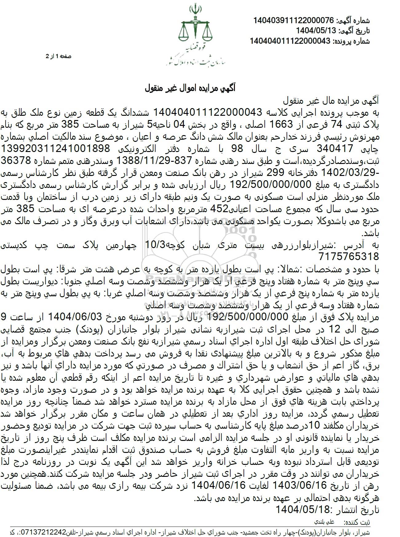 مزایده فروش ششدانگ یک قطعه زمین با مساحت 385 مترمربع با پلاک ثبتی 47 فرعی از 1663 اصلی