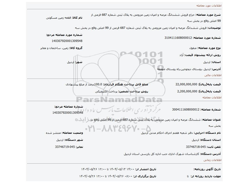 شرح مورد معامله: حراج فروش ششدانگ عرصه و اعیان زمین مزروعی به پلاک ثبتی شماره 687 فرعی از 99 اصلی واقع در بخش سه | نام کالا: قطعه زمین مسکونی | |