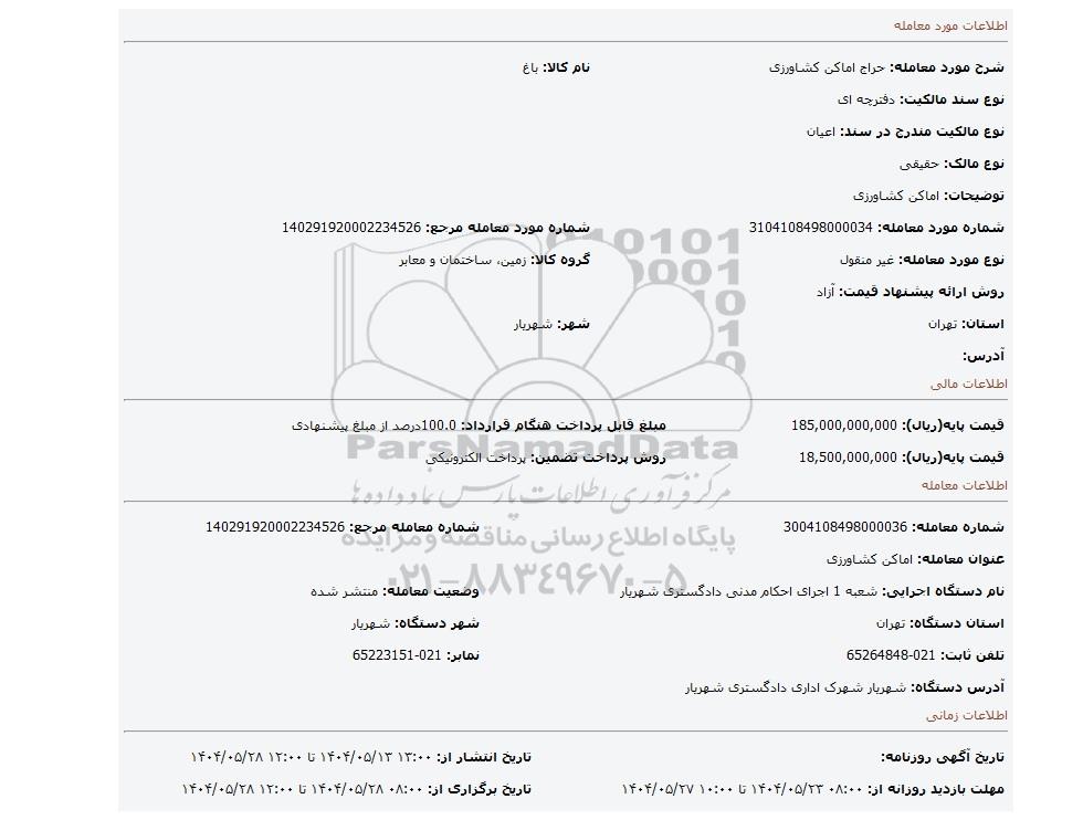 شرح مورد معامله: حراج اماکن کشاورزینام کالا: باغ