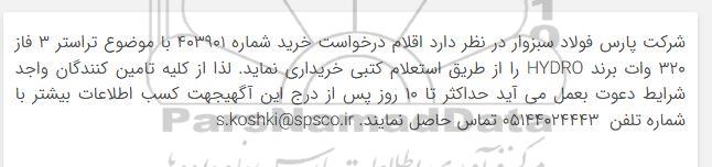 شرکت پارس فولاد سبزوار در نظر دارد اقلام درخواست خرید شماره 403901 با موضوع تراستر 3 فاز 320 وات برند HYDRO را از طریق استعلام کتبی خریداری نماید. لذا از کلیه تامین کنندگان واجد شرایط دعوت بعمل می آید حداکثر تا 10 روز پس از درج این آگهی جهت کسب اطلاعات بیشتر با شماره تلفن 05144024442 تماس حاصل نمایند. s.koshki@spsco.ir