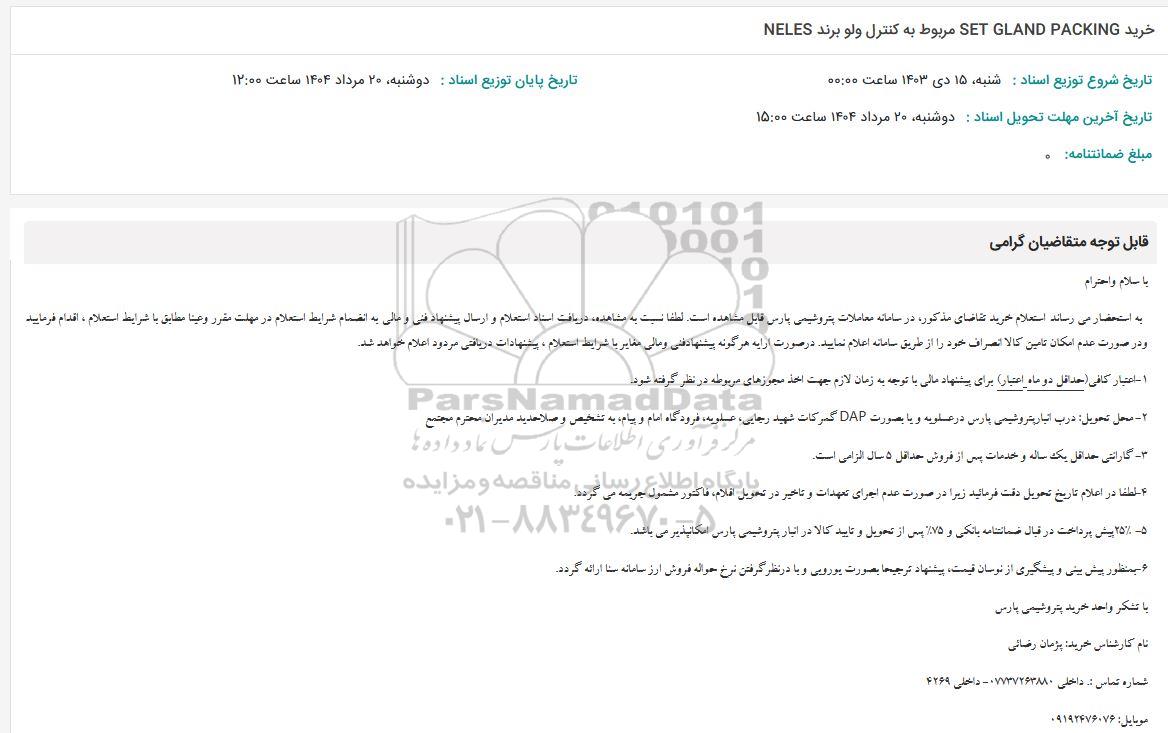 استعلام بها و موضوع استعلام استعلام خرید SET GLAND PACKING مربوط به کنترل ولو برند NELES به اطلاع کلیه شرکتها و افراد متخصص واجد شرایط میرساند، آگهی گذار در نظر دارد از طریق استعلام بها، نسبت به انتخاب و دریافت پیشنهادات اقدام نماید. این استعلام با کد آگهی ثبت شده در سامانه خبرگزاری پارس نماد : 9366950 منتشر شده است. مشخصات استعلام : تاریخ شروع استعلام: 1404/05/13 آخرین مهلت ارسال پیشنهاد قیمت : 1404/05/20 و محل اجرای پروژه : استان بوشهر میباشد. استعلام قیمت مورد درخواست : استعلام خرید SET GLAND PACKING مربوط به کنترل ولو برند NELES با دستهبندیهای تخصصی و گروه های مرتبط : ابزار دقیق, شیرآلات, قطعات لاستیکی, لوله و اتصالات, تجهیزات نفت و گاز, استعلام اطلاع رسانی میگردد.
