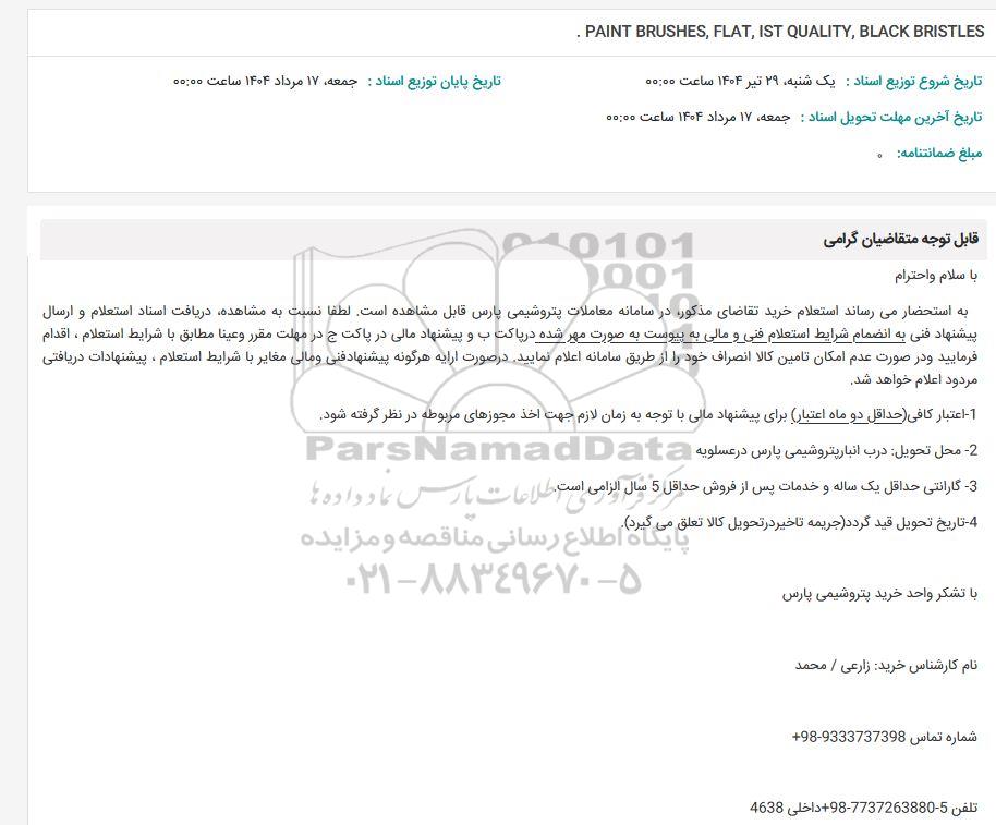 استعلام بها و موضوع استعلام استعلام PAINT BRUSHES, FLAT, IST QUALITY, BLACK BRISTLES به اطلاع کلیه شرکتها و افراد متخصص واجد شرایط میرساند، آگهی گذار در نظر دارد از طریق استعلام بها، نسبت به انتخاب و دریافت پیشنهادات اقدام نماید. این استعلام با کد آگهی ثبت شده در سامانه خبرگزاری پارس نماد : 9366983 منتشر شده است. مشخصات استعلام : تاریخ شروع استعلام: 1404/05/13 آخرین مهلت ارسال پیشنهاد قیمت : 1404/05/17 و محل اجرای پروژه : استان بوشهر میباشد. استعلام قیمت مورد درخواست : استعلام PAINT BRUSHES, FLAT, IST QUALITY, BLACK BRISTLES با دستهبندیهای تخصصی و گروه های مرتبط : ابزار و یراق آلات, تجهیزات نفت و گاز, تجهیزات و ماشین آلات صنعتی, استعلام اطلاع رسانی میگردد.