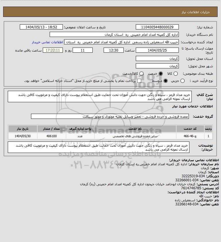 شرح کلی نیاز: خرید مداد قرمز ، سیاه و رنگی جهت دانش آموزان تحت حمایت طبق استعلام پیوست دارای کیفیت و مرغوبیت کافی باشد ارسال نمونه الزامی می باشد