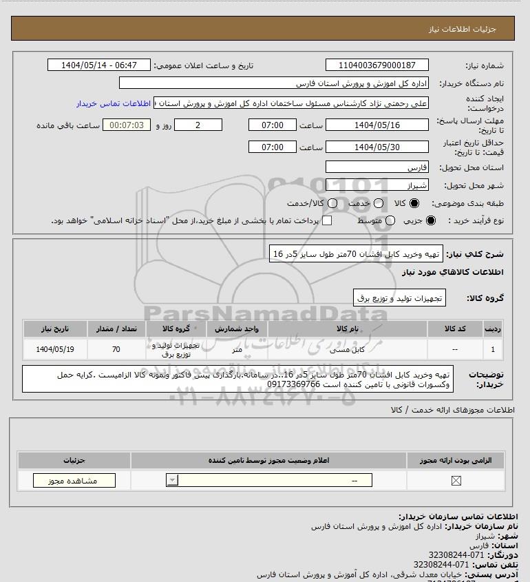 توضیحات خریدار:تهیه وخرید کابل افشان 70متر طول سایز 5در 16..در سامانه.بارگذاری پیش فاکتور ونمونه کالا الزامیست .کرایه حمل وکسورات قانونی با تامین کننده است 09173369766