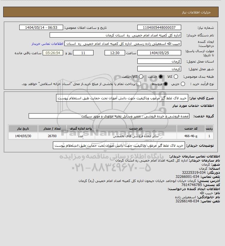 نام دستگاه خریدار:اداره کل کمیته امداد امام خمینی ره استان کرمان