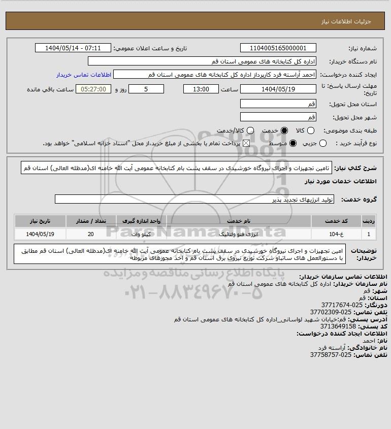 شرح کلی نیاز: تامین تجهیزات و اجرای نیروگاه خورشیدی در سقف پشت بام کتابخانه عمومی آیت الله خامنه ای(مدظله العالی) استان قم