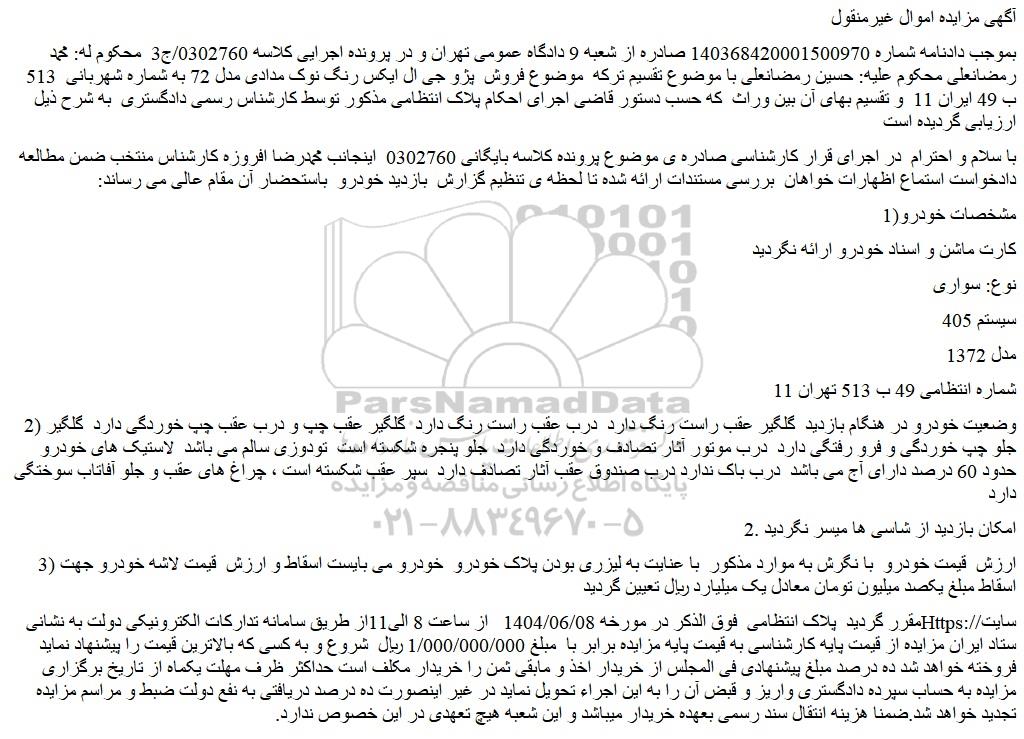 بموجب دادنامه شماره 140368420001500970 صادره از شعبه 9 دادگاه عمومی تهران و در پرونده اجرایی کلاسه 0302760/ج3 محکوم له: محمد رمضانعلی محکوم علیه: حسین رمضانعلی با موضوع تقسیم ترکه موضوع فروش پژو جی ال ایکس رنگ نوک مدادی مدل 72 به شماره شهربانی 513 ب 49 ایران 11 و تقسیم بهای آن بین وراث که حسب دستور قاضی اجرای احکام پلاک انتظامی مذکور توسط کارشناس رسمی دادگستری به شرح ذیل ارزیابی گردیده است