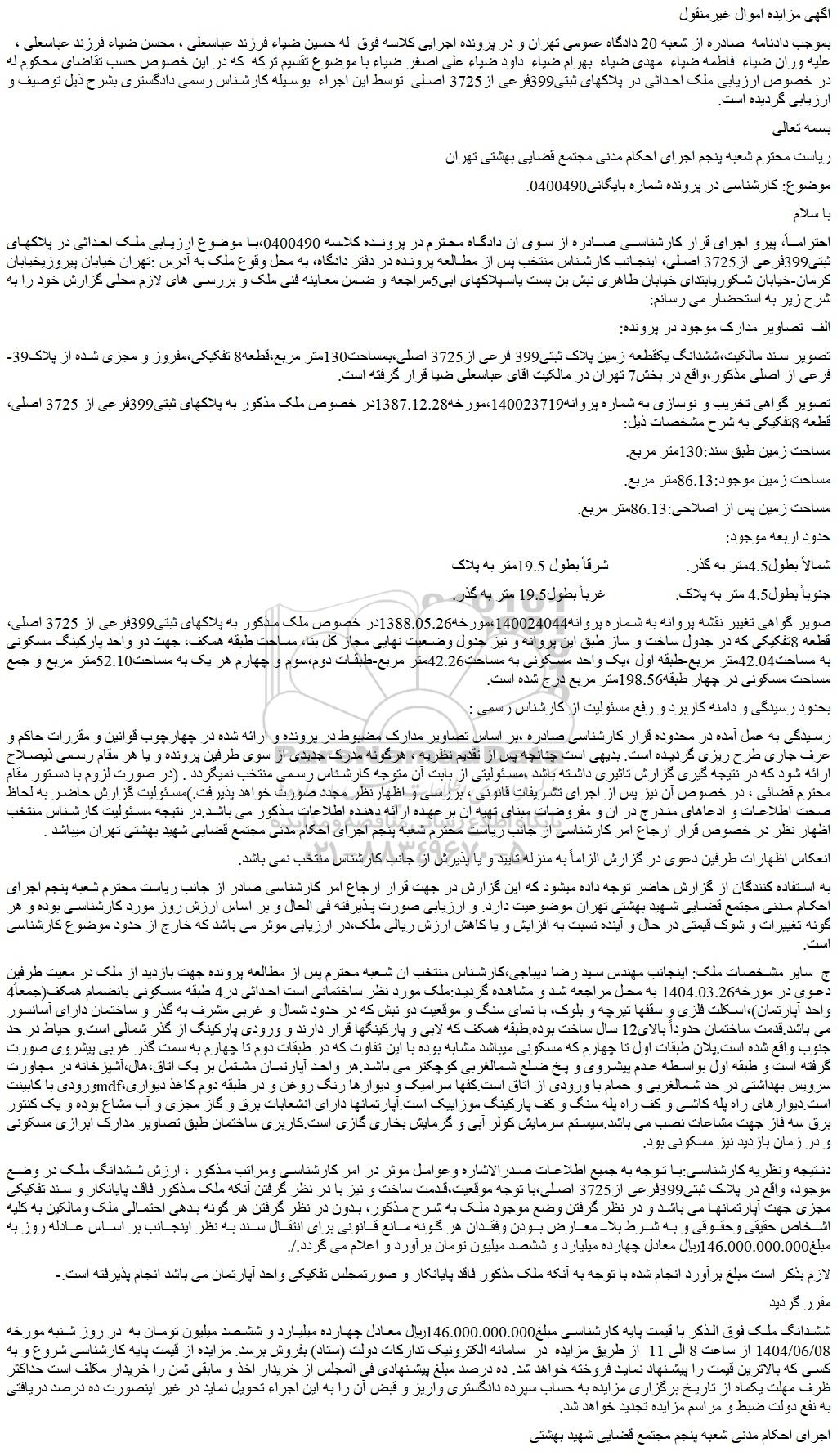 بموجب دادنامه صادره از شعبه 20 دادگاه عمومی تهران و در پرونده اجرایی کلاسه فوق له حسین ضیاء فرزند عباسعلی ، محسن ضیاء فرزند عباسعلی ، علیه وران ضیاء فاطمه ضیاء مهدی ضیاء بهرام ضیاء داود ضیاء علی اصغر ضیاء با موضوع تقسیم ترکه که در این خصوص حسب تقاضای محکوم له در خصوص ارزیابی ملک احداثی در پلاکهای ثبتی399فرعی از3725 اصلی توسط این اجراء بوسیله کارشناس رسمی دادگستری بشرح ذیل توصیف و ارزیابی گردیده است.