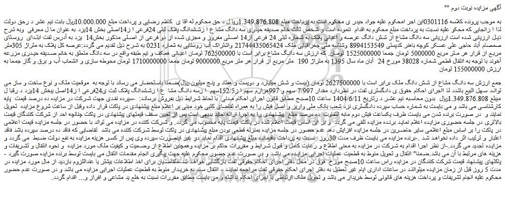 جمع ارزش سه دانگ مشاع از شش دانگ ملک برابر است با 2627500000 تومان (بیست و شش میلیارد و دویست و هفتاد و پنج میلیون ریال)ضمنا باستحضار می رساند با توجه به موقعیت ملک و نوع ساخت و ساز می تواند سهل البیع باشدد لذ ااجرای احکام حقوق ی دادگستری تفت در نظردارد مقدار 7/997 سهم و 997هزارم سهم ا ز152/5سهم ا زسه دانگ مشا ع ا زششدانگ پلاک ثبت ی24فرعی ا ز14اصل یبخش 14یزد د رقبا ل میبلغ 1.349.876.808ریال بدون محاسبه نیم عشر د رتاریخ 1404/6/11 ساعت 10صبح مطابق قانون اجرای احکام مدنی با لحاظ شرایط ذیل بفروش برساند: -سپرده نقدی جهت شرکت در مزایده ده درصد قیمت پایه کارشناسی می باشد و می بایست به شماره حساب سپرده دادگستری نزد شعب بانک ملی واریز و اصل فیش را به همراه تقاضای کتبی خود مبنی بر اعلام مبلغ پیشنهادی در پاکت قرار داده وقبل از ساعت شروع مزایده تحویل نمایند و در صورت برنده شدن می بایست ظرف یکساعت فیش دوم مابه التفاوت ده درصد مبلغ پیشنهادی را به اجرا ارائه نماید بدیهی است پس از تعیین سقف قیمتهای پیشنهادی در پاکت چنانچه احد از شرکت کنندگان قیمت بالاتری در جلسه حضوری مزایده اعلام نماید برنده مزایده تلقی می گردد و بر این اساس قیمت اعلام شده در پاکت قیمت پایه محسوب می گردد. و شرکت کننده در مزایده می تواند با حضور در جلسه مزایده قیمت اعلامی در پاکت را بر اساس مبلغ اعلامی سایر حاضرین در جلسه مزایده افزایش دهد عدم حضور در جلسه مزایده بمنزله قطعی بودن مبلغ پیشنهادی در پاکت توسط شرکت کننده می باشد تقاضایی که فاقد ده درصد سپرده باشد فاقد اعتبار و ترتیب اثر داده نخواهد شد .-برنده مزایده می بایست ظرف مدت 30روز نسبت به پرداخت باقیمانده مبلغ پیشنهادی اقدام نماید در غیر اینصورت سپرده وی پس از کسر هزینه مزایده به نفع دولت ضبط می گردد و مزایده تجدید می گردد.-از نظر اجرا اقدام به شرکت در مزایده به معنی اطلاع و رعایت کامل و قبول شرایط و مقررات حاکم بر مزایده وهمچنین اطلاع از وضعیت و کیفیت ملک مورد مزایده و نحوه انتقال و تشریفات و هزینه های مرتبط با آن می باشد.ضمنا" انتقال و تحویل منوط به قطعیت عملیات اجرایی مزایده می باشد و در صورت عدم حضور محکوم علیه جهت پیگیری انجام مقدمات انتقال می بایست توسط برنده مزایده صورت گیرد -پاکتهای پیشنهاد قیمت شرکت کنندگان در مزایده راس ساعت 10صبح مورخ فوق در محل دفتر اجرای احکام حقوقی تفت بازگشایی خواهد شد-متقاضیان برای اخذ اطلاعات بیشتر یا عنداللزوم بازدید از مال مورد مزایده در مدت 5 روز قبل از زمان مزایده میتوانند در ساعات اداری ایام غیر تعطیل به دفتر اجرای احکام حقوقی تفت مراجعه نمایند - انتقال سند به خریدار منوط به قطعیت عملیات اجرایی مزایده می باشد و در صورت عدم حضور محکوم علیه انجام تشریفات و پرداخت هزینه های قانونی توسط خریدار می باشد و تحویل ملک ارتباطی با اجرای احکام نداشته و می بایست مطابق مقررات نسبت به خلع ید مشاعی و افراز و... اقدام گردد.