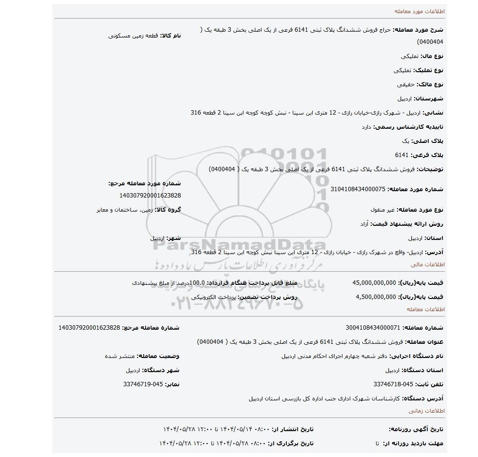 مزایده عمومی مزایده فروش ششدانگ پلاک ثبتی 6141 فرعی از یک اصلی بخش 3 طبقه یک ( 0400404) برگزار میگردد. از کلیه افراد متخصص و شرکت‌های واجد شرایط دعوت به عمل می‌آید تا در این مزایده با کد خبرگزاری پارس نماد : 9368663 شرکت نمایند تاریخ شروع مزایده : 1404/05/14 مهلت شرکت در مزایده: تا پایان روز 1404/05/28 مکان برگزاری اموال واگذاری استان‌های اردبیل و دسته‌بندی‌های مربوط به این حراجی املاک و زمین میباشد. اطلاعات دقیق‌تر درباره شرایط شرکت در مزایده آنلاین و نحوه ارسال مدارک، الزامات پروژه و دریافت اسناد مزایده و تاریخ بازگشایی پاکت‌ها، در بخش اطلاعات تکمیلی این آگهی درج شده است.
