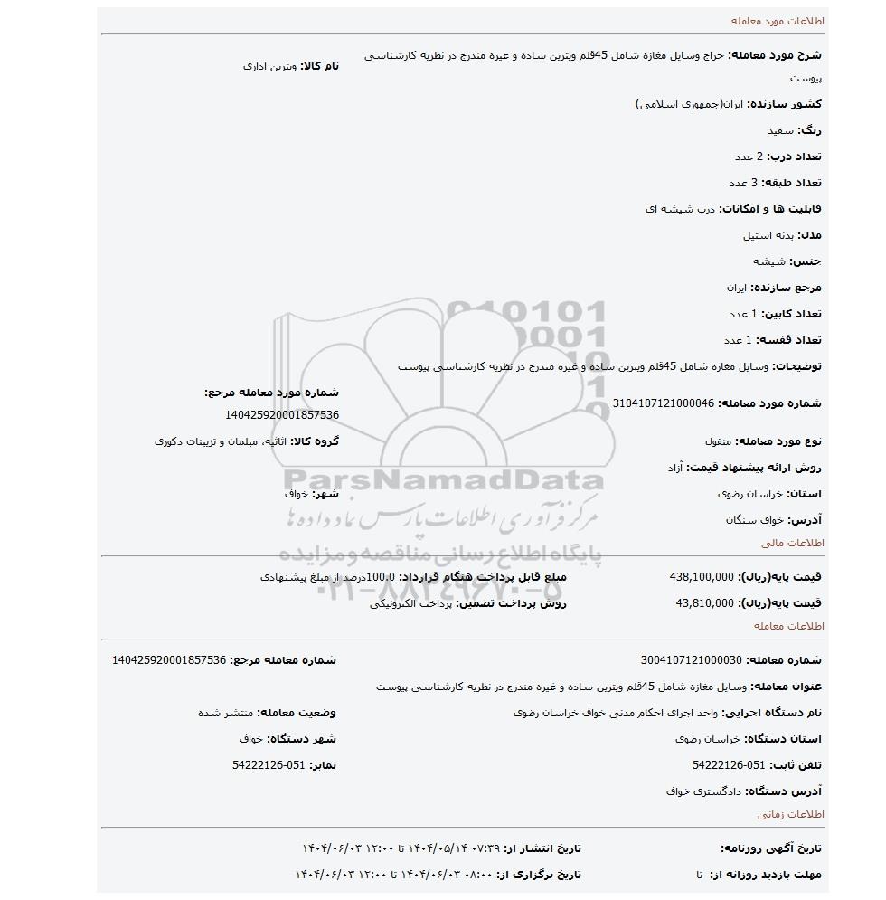 | شماره مورد معامله: 3104107121000046 | شماره مورد معامله مرجع: 140425920001857536 | |