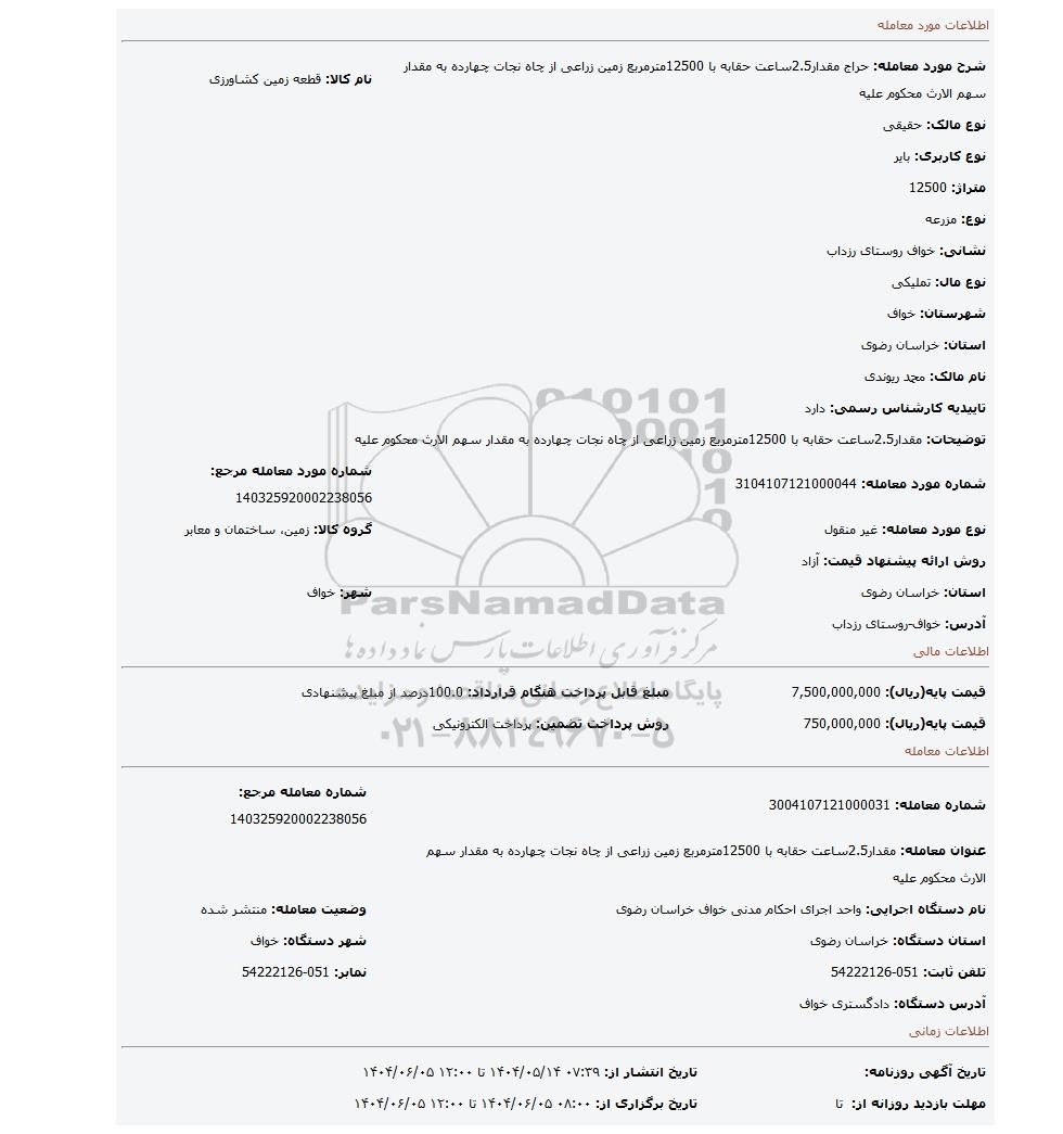 شرح مورد معامله: حراج مقدار2.5ساعت حقابه با 12500مترمربع زمین زراعی از چاه نجات چهارده به مقدار سهم الارث محکوم علیهنام کالا: قطعه زمین کشاورزی