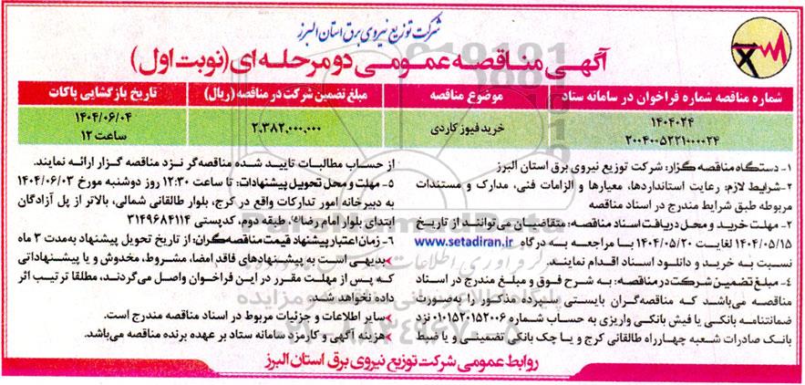 مناقصه عمومی خرید فیوز کاردی از کلیه افراد متخصص و شرکتها واجد شرایط دعوت به عمل میآید در مناقصه با کد خبرگزاری پارس نماد: 9369366 شرکت نمایند.