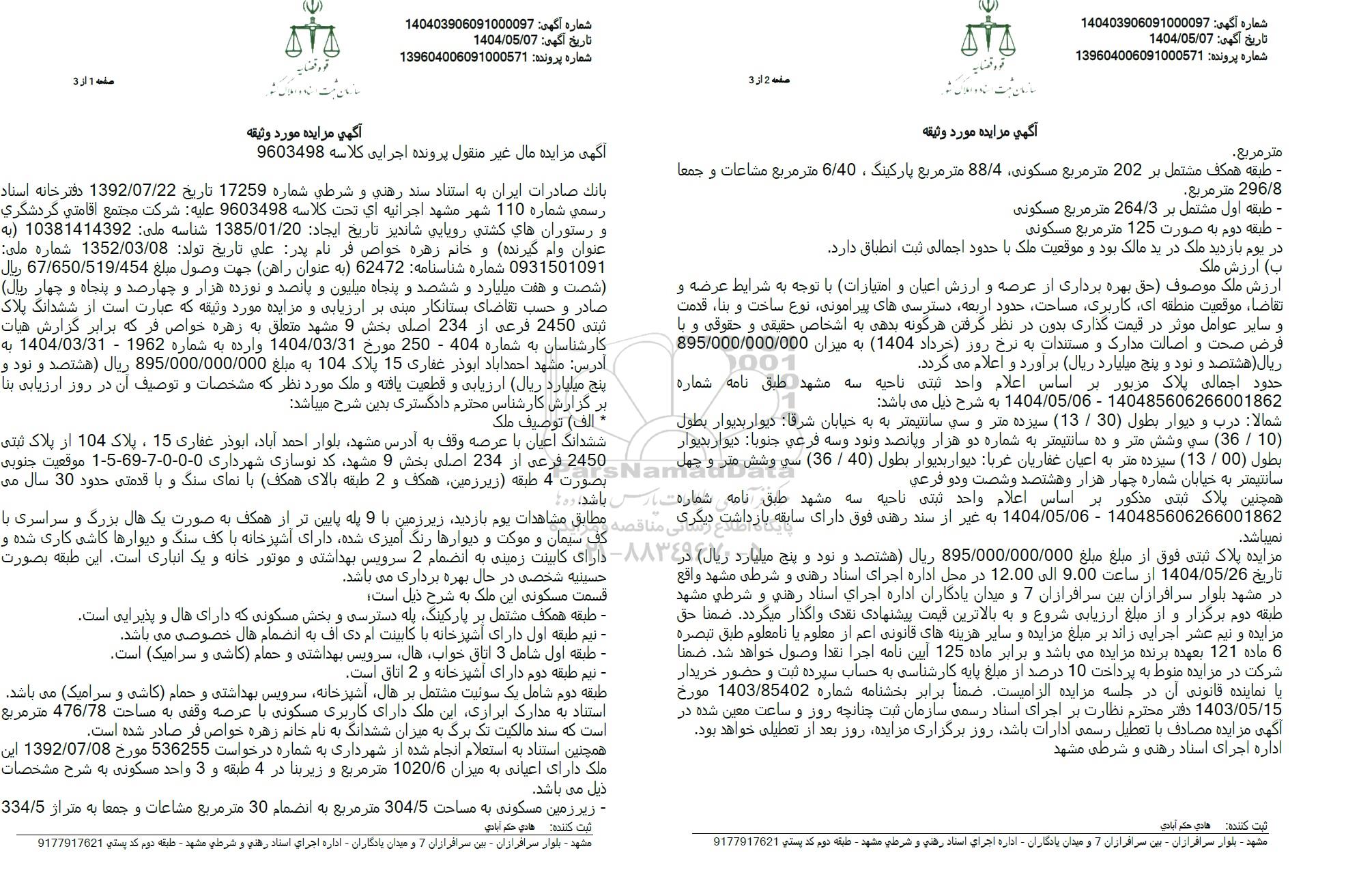 اگهی مزایده غیر منقول پرونده کلاسه 9603498
