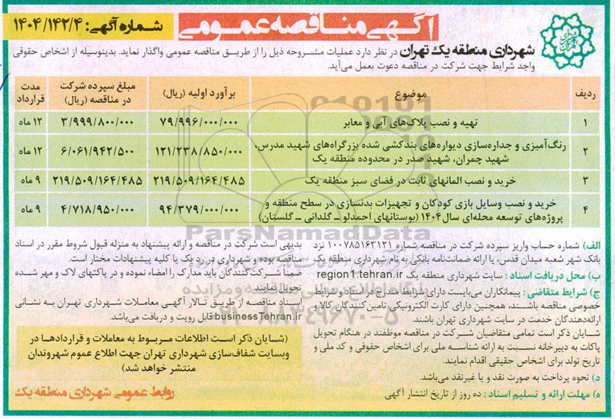 شهرداری منطقه یک تهران در نظر دارد عملیات مشروحه ذیل را از طریق مناقصه عمومی واگذار نماید. بدینوسیله از اشخاص حقوقی واجد شرایط جهت شرکت در مناقصه دعوت بعمل می آید.