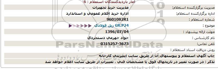 استعلام بها و موضوع استعلام استعلام,استعلام ریل فولادی به اطلاع کلیه شرکتها و افراد متخصص واجد شرایط میرساند، آگهی گذار در نظر دارد از طریق استعلام بها، نسبت به انتخاب و دریافت پیشنهادات اقدام نماید. این استعلام با کد آگهی ثبت شده در سامانه خبرگزاری پارس نماد : 936970 منتشر شده است. مشخصات استعلام : تاریخ شروع استعلام: 1396/06/27 آخرین مهلت ارسال پیشنهاد قیمت : 1396/07/04 و محل اجرای پروژه : استان اصفهان میباشد. استعلام قیمت مورد درخواست : استعلام,استعلام ریل فولادی با دستهبندیهای تخصصی و گروه های مرتبط : راه آهن, استعلام اطلاع رسانی میگردد.