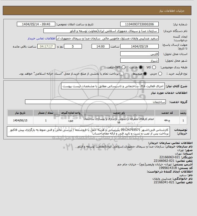 شرح کلی نیاز: اجرای فعالیت های ساختمانی و تاسیساتی مطابق با مشخصات لیست پیوست