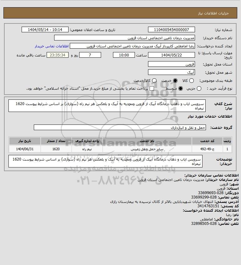 شرح کلی نیاز: سرویس ایاب و ذهاب درمانگاه آبیک از قزوین ومحمدیه به آبیک و بلعکس هر نیم راه (سواری) بر اساس شرایط پیوست 1620 نیمراه