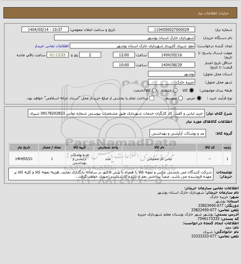 شرح کلی نیاز: خرید لباس و کفش کار کارگران خدمات شهرداری طبق مشخصات پیوستی شماره تماس 09178202823 شیری
