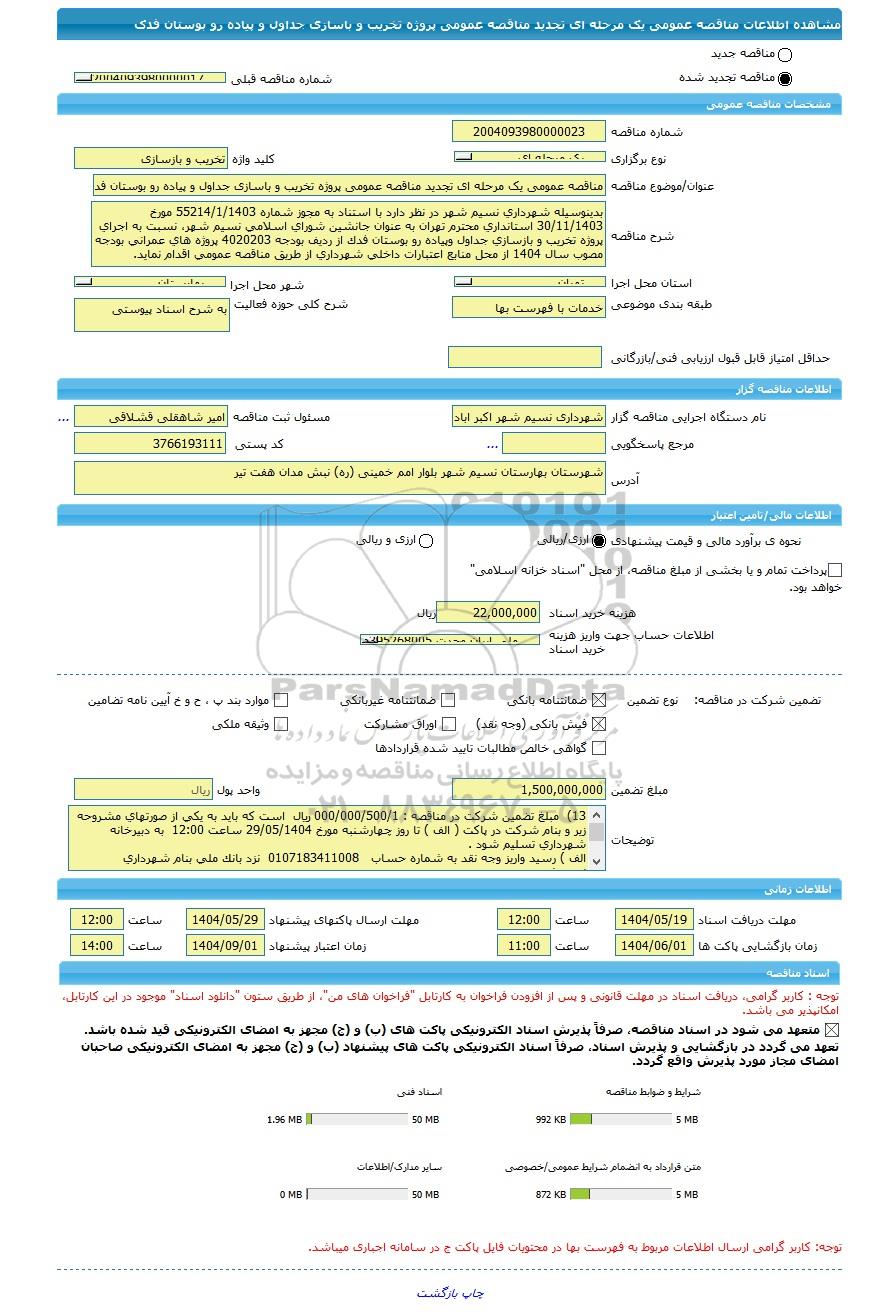 شرح مناقصهبدينوسيله شهرداري نسيم شهر در نظر دارد با استناد به مجوز شماره 55214/1/1403 مورخ 30/11/1403 استانداري محترم تهران به عنوان جانشين شوراي اسلامي نسيم ‌شهر، نسبت به اجراي پروژه تخريب و بازسازي جداول وپياده رو بوستان فدك از رديف بودجه 4020203 پروژه هاي عمراني بودجه مصوب سال 1404 از محل منابع اعتبارات داخلي شهرداري از طريق مناقصه عمومي اقدام نمايد.