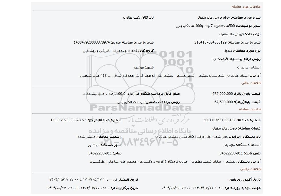 شرح مورد معامله: حراج فروش مال منقولنام کالا: لامپ هالوژن