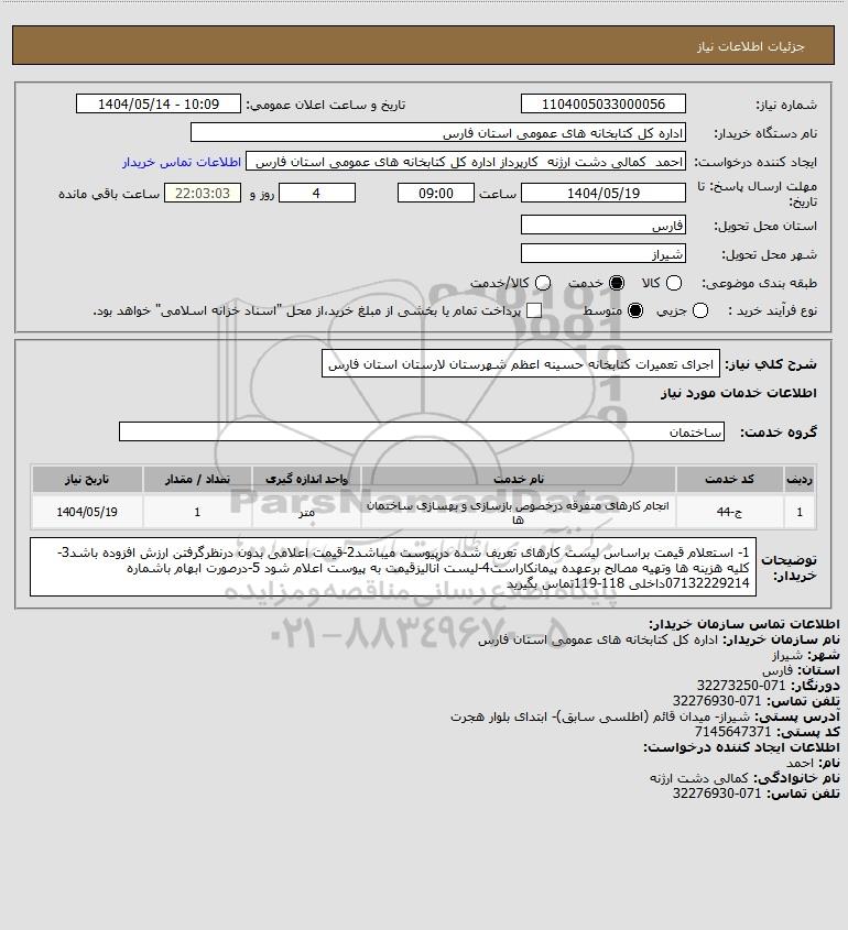 شرح کلی نیاز: اجرای تعمیرات کتابخانه حسینه اعظم شهرستان لارستان استان فارس