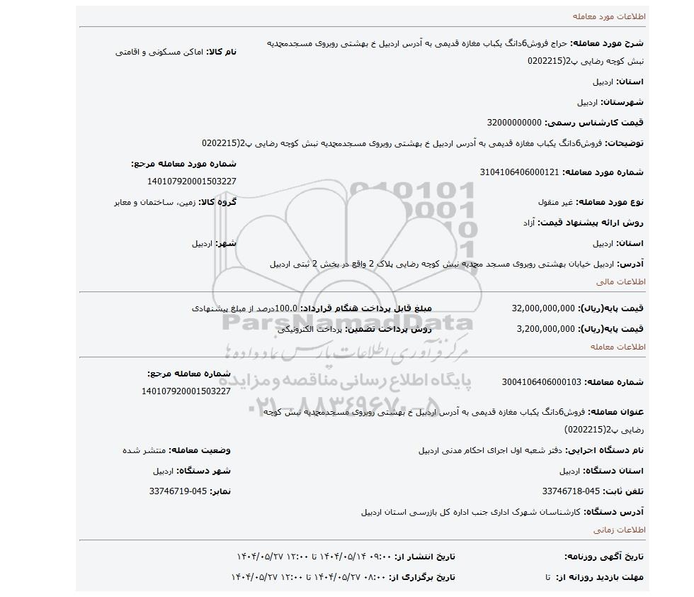 شماره معامله: 3004106406000103 | شماره معامله مرجع: 140107920001503227 | |