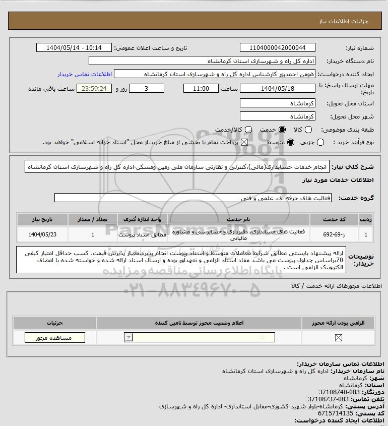 شرح کلی نیاز: انجام خدمات حسابداری(مالی)،کنترلی و نظارتی سازمان ملی زمین ومسکن-اداره کل راه و شهرسازی استان کرمانشاه