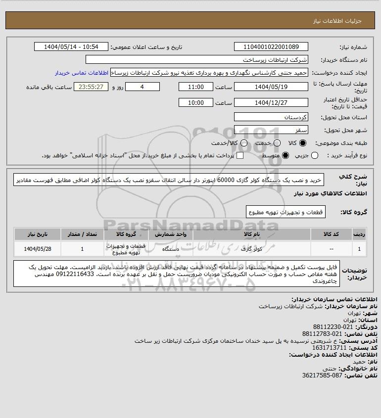 شرح کلی نیاز: خرید و نصب یک دستگاه کولر گازی 60000 اینورتر دار سالن انتقال سقزو نصب یک دستگاه کولر اضافی مطابق فهرست مقادیر