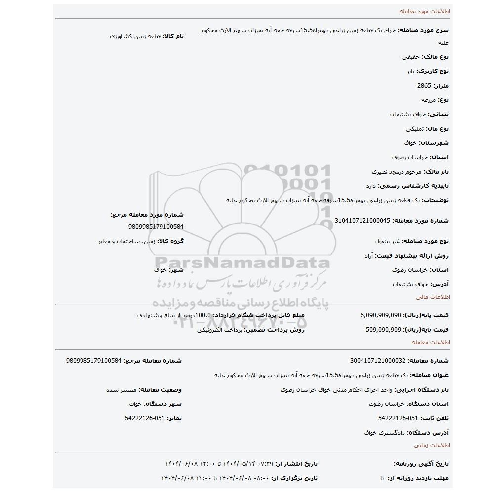 5 مزایده اجاره زمین کشاورزی 9813622 1404/08/17 new not special not payed خراسان رضوی