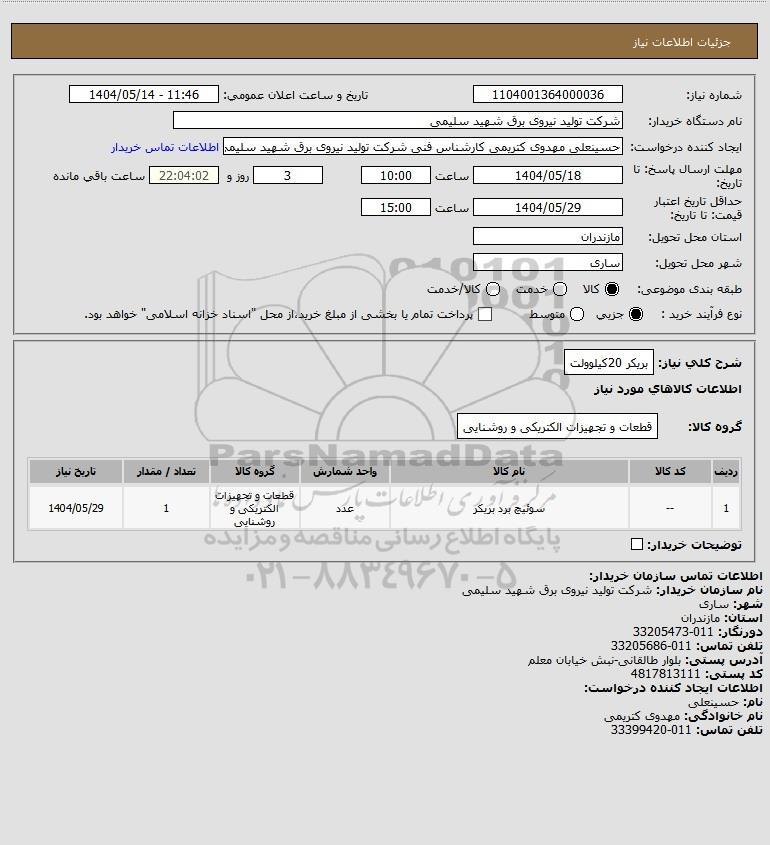 استعلام بها و موضوع استعلام استعلام بریکر 20کیلوولت به اطلاع کلیه شرکتها و افراد متخصص واجد شرایط میرساند، آگهی گذار در نظر دارد از طریق استعلام بها، نسبت به انتخاب و دریافت پیشنهادات اقدام نماید. این استعلام با کد آگهی ثبت شده در سامانه خبرگزاری پارس نماد : 9371503 منتشر شده است. مشخصات استعلام : تاریخ شروع استعلام: 1404/05/14 آخرین مهلت ارسال پیشنهاد قیمت : 1404/05/18 و محل اجرای پروژه : استان مازندران میباشد. استعلام قیمت مورد درخواست : استعلام بریکر 20کیلوولت با دستهبندیهای تخصصی و گروه های مرتبط : انواع کلید و پریزهای برقی و صنعتی, تجهیزات برق و الکترونیک, استعلام اطلاع رسانی میگردد.