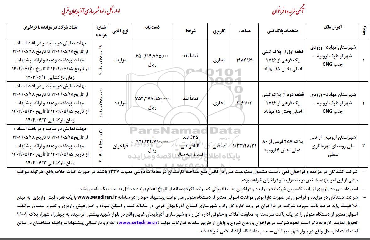 | 2 | شهرستان مهاباد - ورودی شهر از طرف ارومیه - جنب CNG | قطعه دوم از پلاک ثبتی یک فرعی از 2716 اصلی بخش 15 مهاباد | 2061/3 | تجاری | تماما نقد | 752.275.950.000 ریال | مزایده | 2004000365000020 |