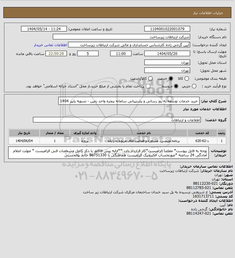 شرح کلی نیاز: خرید خدمات توسعه به روز رسانی و پشتیبانی سامانه پنجره واحد زمین - تسویه پاییز 1404