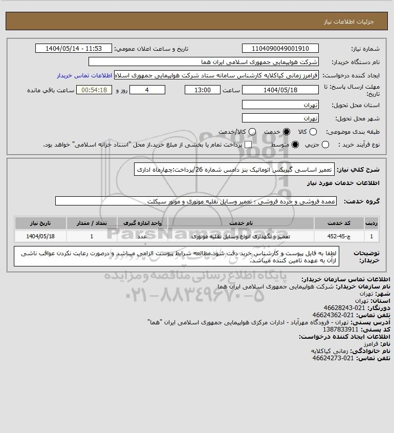 شرح کلی نیاز: تعمیر اساسی گیربکس اتوماتیک بنز دامس شماره 26/پرداخت:چهارماه اداری