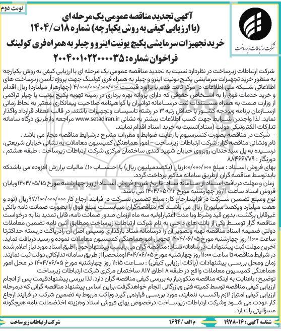شرکت ارتباطات زیر ساخت در نظر دارد نسبت به برگزاری مناقصه عمومی یک مرحله ای با ارزیابی کیفی به روش یکپارچه به منظور خرید تجهیزات سرمایشی پکیج یونیت اینرو و چیلر به همراه فری کولینگ جهت پروژه تأمین زیرساختهای اطلاعاتی شبکه ملی اطلاعات در مرکز ثابت قدم با برآورد قیمت 4.000.000.000.000 (چهارهزار میلیارد) ریال اقدام و خرید خدمات فوق را به اشخاص حقوقی واجد شرایط که دارای پروانه تولید و بهره برداری در زمینه ساخت و تولید تجهیزات سرمایش و تهویه از قبیل تهویه پکیج یونیت و چیلر از وزارت صمت یا گواهی دانش بنیان در حوزه سیستمهای سرمایش از معاونت علمی و فناوری و اقتصاد دانش بنیان ریاست جمهوری و گواهینامه تشخیص پیمانکاری از سازمان برنامه و بودجه کشور در حوزه تاسیسات و تجهیزات حداقل رتبه 3 با اعتبار کافی از لحاظ زمانی باشند در قالب انعقاد قرارداد واگذار نماید. لذا واجدین شرایط جهت کسب اطلاعات بیشتر به نشانی ستاد ایران مراجعه و از طریق درگاه سامانه تدارکات الکترونيکي دولت (ستاد) نسبت به خرید اسناد اقدام نمایند.